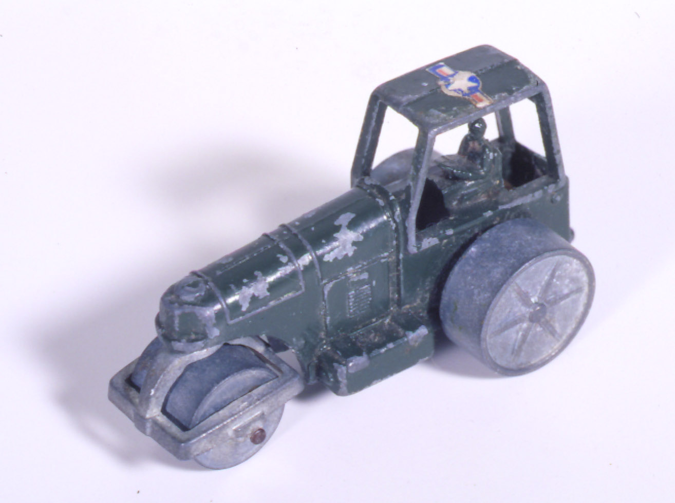 English: Army road roller diecast zinc toy roller, green with metal wheels, marked "FUN HO! NO 37-MADE IN -NEW ZEALAND", sticker with white star on blue and red stripe